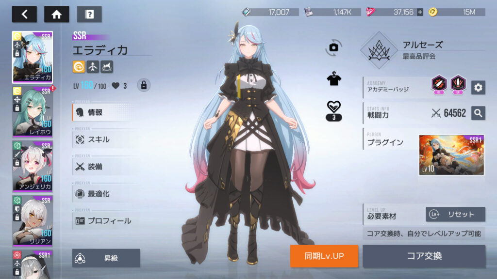 エラディカはSSRのLv.160、スキルLv.3/3/3/3/1、装備なし/なし/MR/MR/MR、最適化1-1