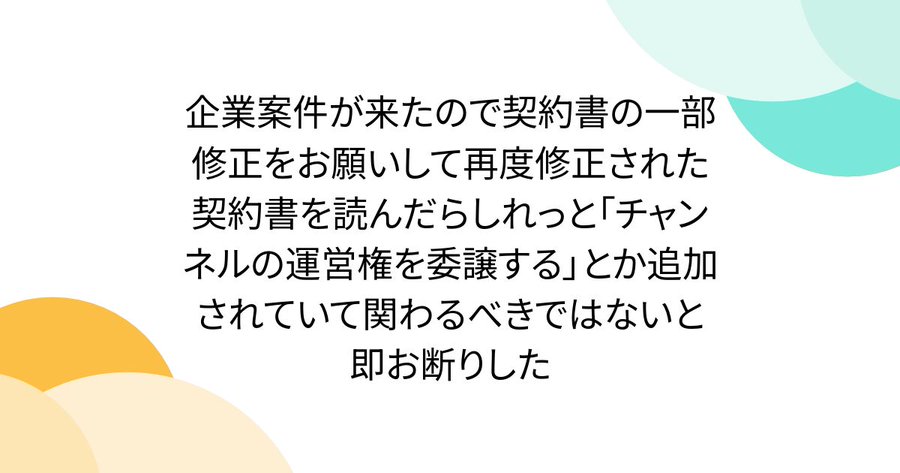 企業案件が来たので契約書の一部修正をお願いして再度修正された契約書を読んだらしれっと「チャンネルの運営権を委譲する」とか追加されていて関わるべきではないと即お断りした