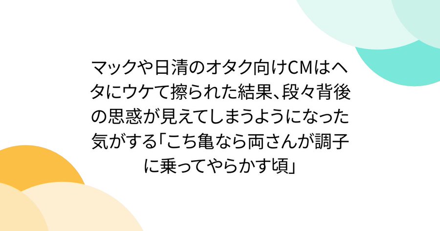 日清はともかく、マクドナルドのオタク向けCMは非オタが作ってるのがバレバレだしな。オタクが見ても反感買うだけだし、非オタ視聴者には何が何やらだろうし。あれを見たところで、マクドナルドに行きたくはならないな