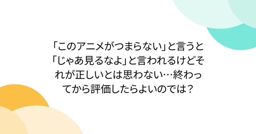 「このアニメがつまらない」と言うと「じゃあ見るなよ」と言われるけどそれが正しいとは思わない…終わってから評価したらよいのでは? https://togetter.com/li/2678230 #Togetterより つまらないアニメは見るのすぐやめる派だなぁ。つまらないと公言してまで見るもんじゃないよなぁ、アニメ