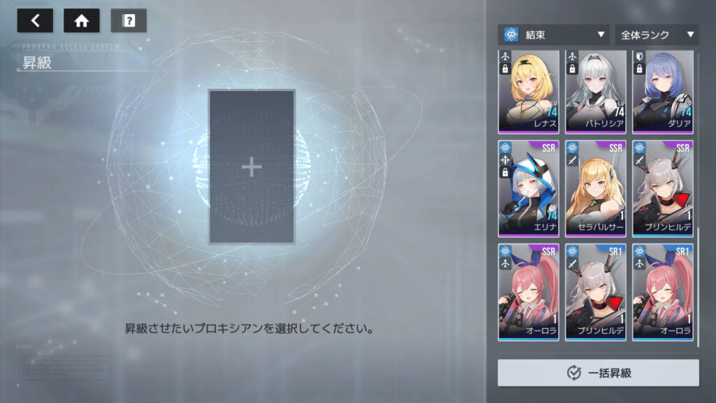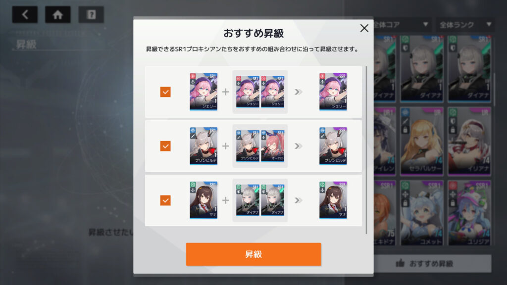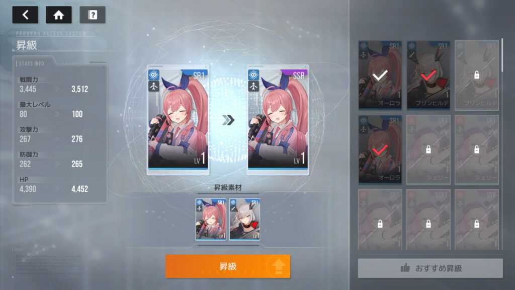 こないだ解説動画で見たんだが、SRから素材SSR1を作る時、同じキャラの素材SSRが2枚必要になるんだが、おすすめ昇級だと、手持ちの素材SSRとは違うキャラのSSRを推奨されることがある、ので、素材SSRを作る時は同じキャラのを作るように注意する