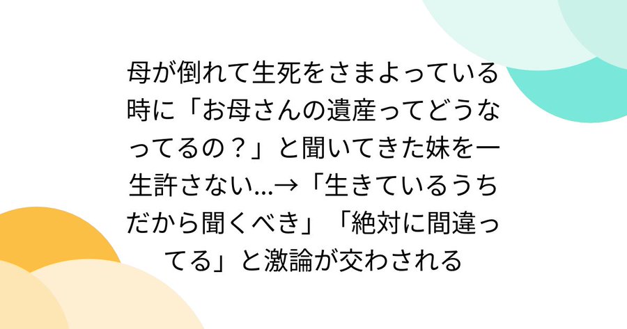 母が倒れて生死をさまよっている時に「お母さんの遺産ってどうなってるの?」と聞いてきた妹を一生許さない…→「生きているうちだから聞くべき」「絶対に間違ってる」と激論が交わされる https://togetter.com/li/2609394 #Togetterより そういう風に育てた母親が悪いとしか。妹は、介護はしない、金はいる、と言ってるそうなんで、姉の元ツイ主に対しても内心不満が溜まってたんじゃないの