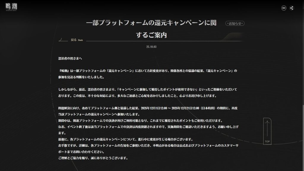 鳴潮のEPIC課金問題。EPICでは課金額の20%をポイント還元するキャンペーンをやっていて、鳴潮も参加していたため、一部の重課金プレイヤーが多額の課金でポイントを大量に貰っていたんだが、9月25日に鳴潮がこのキャンペーンから突然脱退し、EPICで課金できなくなったばかりか、せっかく貰ったポイントも使えなくなってしまい、EPICで課金してた鳴潮プレイヤー達を途方に暮れさせた事件