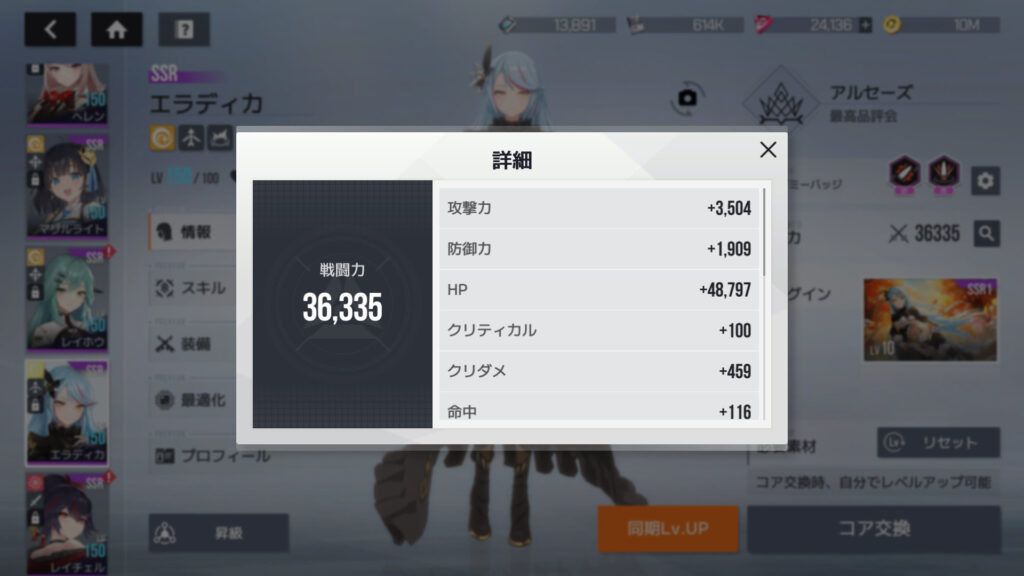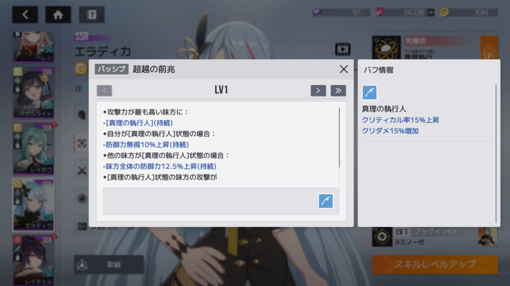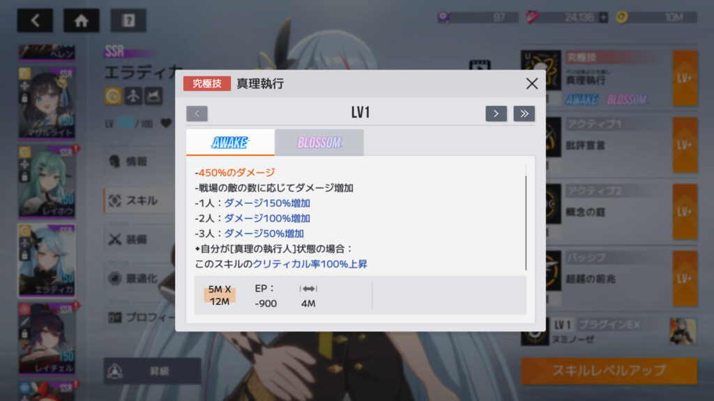 エラディカは、攻撃力が最も高い味方をパッシブスキルで「真理の執行人」にするんだが、自分が「真理の執行人」の時、究極技AWAKEのクリ率が100%になる。このため、クリダメを上げられるだけ上げておくと、究極技AWAKEの威力が最大になる