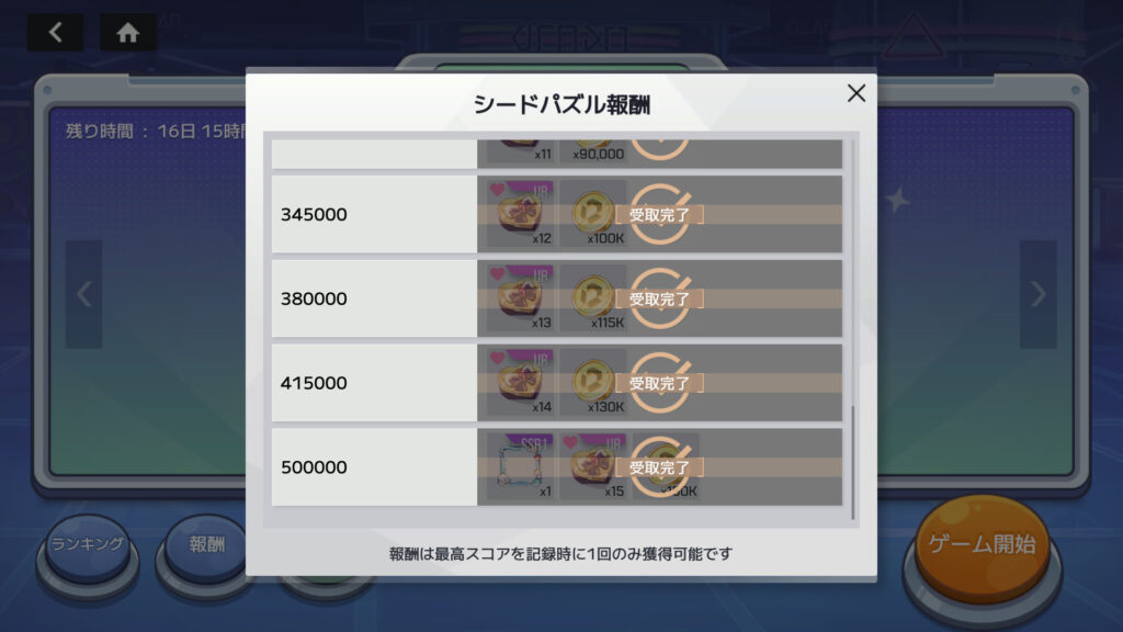 541,000点で全報酬ゲット。これでイベント「シードパズル」クリア
