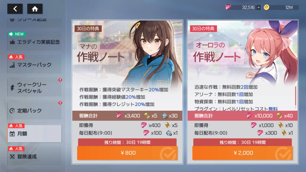 マナの作戦ノートとオーロラの作戦ノート購入。累計課金額26,600円