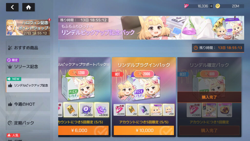 リンデル確定パック購入。累計課金額35,600円。リンデル4枚目