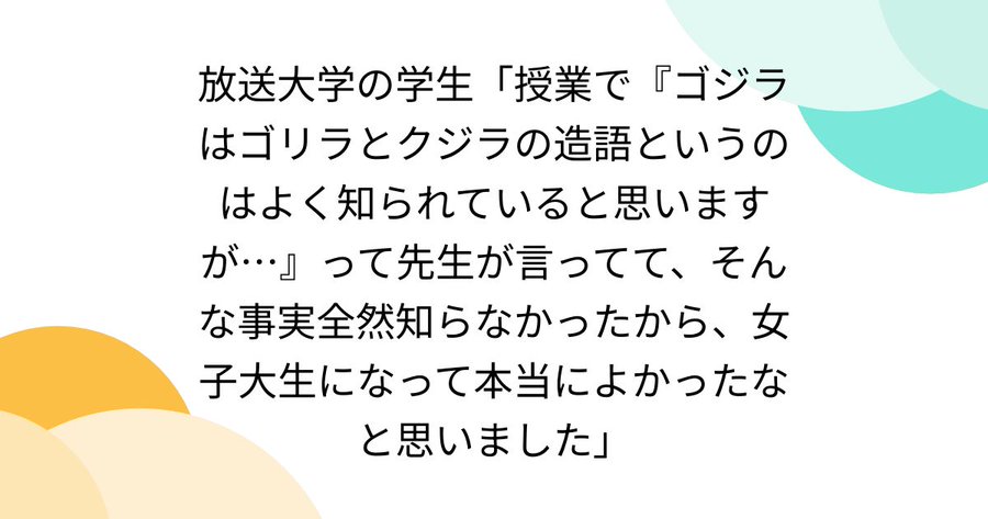 放送大学の学生「授業で『ゴジラはゴリラとクジラの造語というのはよく知られていると思いますが…』って先生が言ってて、そんな事実全然知らなかったから、女子大生になって本当によかったなと思いました」 https://togetter.com/li/2619784 #Togetterより 知らんかった。ゴジラはシン・ゴジラしか見たことないし、それも正直面白いとは思わなかったな