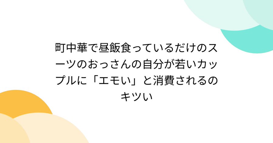 町中華で昼飯食っているだけのスーツのおっさんの自分が若いカップルに「エモい」と消費されるのキツかった https://togetter.com/li/2621775 #Togetterより 自意識過剰。エモいのは町中華の店内であってお前じゃない