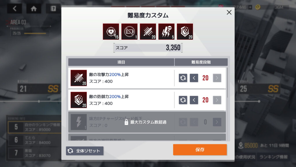 難易度カスタム、最高値は3,350か…。3,250でやってたわ。やり直すのもだるいし、3,350でやるのは次にするか