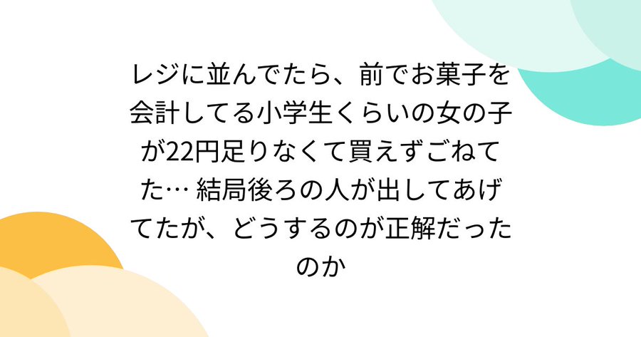 レジに並んでたら、前でお菓子を会計してる小学生くらいの女の子が22円足りなくて買えずごねてた… 結局後ろの人が出してあげてたが、どうするのが正解だったのか