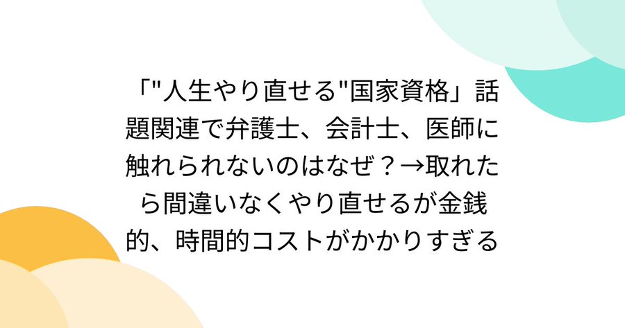 「”人生やり直せる”国家資格」話題関連で弁護士、会計士、医師に触れられないのはなぜ?→取れたら間違いなくやり直せるが金銭的、時間的コストがかかりすぎる https://togetter.com/li/2627779 #Togetterより 本当にこれでやり直せるんなら、元ツイ主はとっくに人生やり直して、こんなツイ垢削除してるんだわ