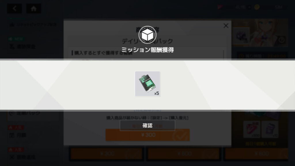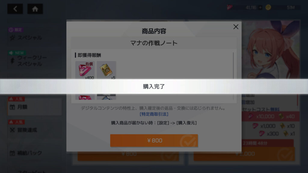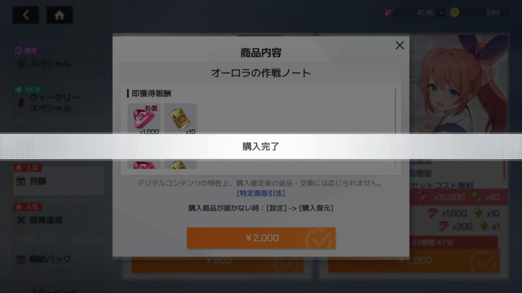 デイリー特典パック、マナの作戦ノート、オーロラの作戦ノートを購入。累計課金額43,200円