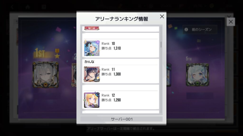 アリーナ11位。貯まってた参加証をけっこうな枚数使って5位まで上げたんだが、戦闘力72万ほどの相手に2連続で負けて順位を落とし、11位まで持ち直したけど、そこから戦闘力70万の相手に勝利しても順位が上がらなくなった