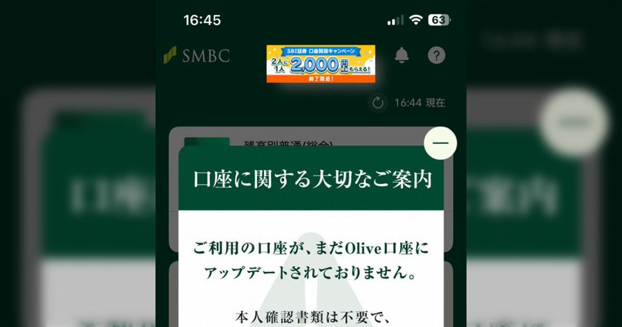 三井住友銀行アプリを起動すると、口座切替の案内が詐欺めいたポップアップで出てくる こういう勧誘方法を使ってくる時点で絶対切り替えない