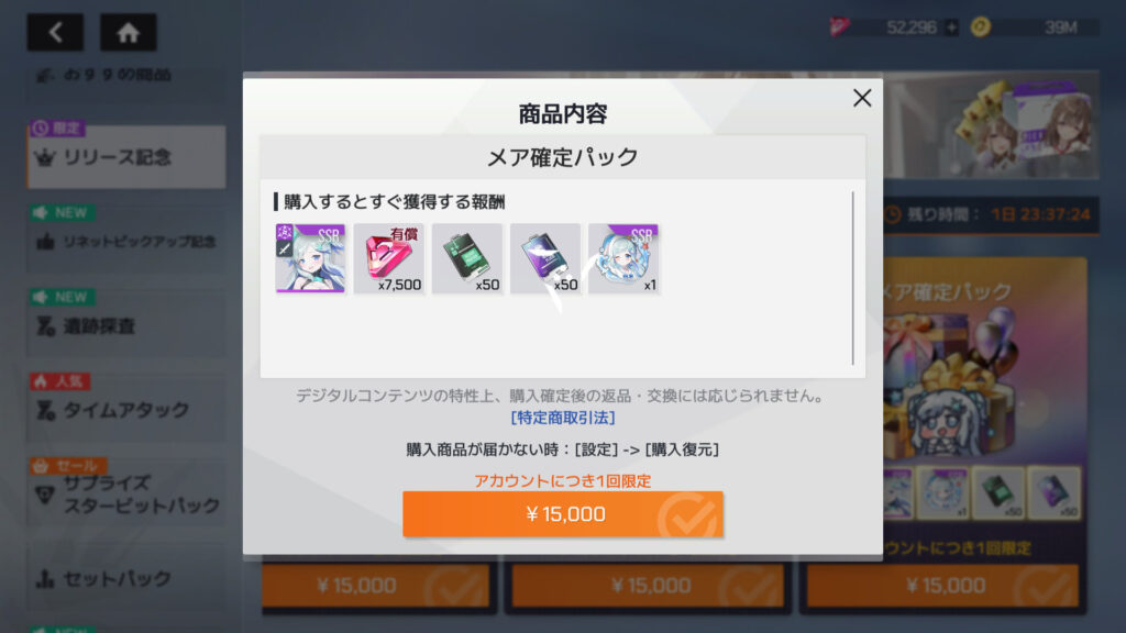 メア確定パック購入。累計課金額59,100円。メア5枚目、メアMR