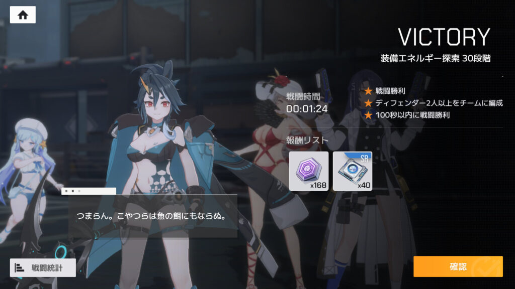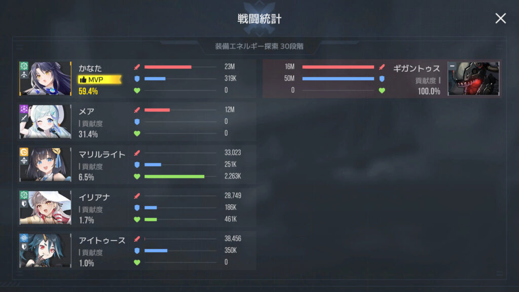 装備エネルギー探索30段階もクリア。撃破直前にかなたが死んでダメかと思ったら、メアの一撃でがっつり削って倒せた