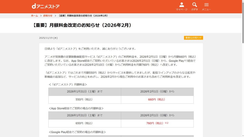 dアニメストア値上げするらしい。まぁ他の動画配信サービスに比べればまだまだ安いし許容範囲