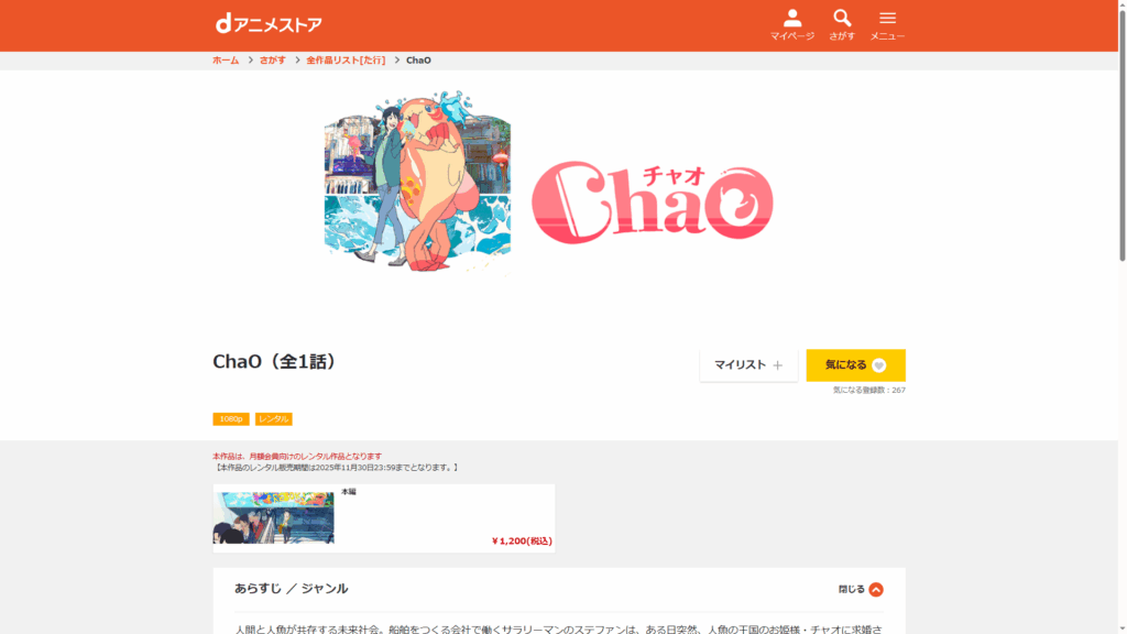 ChaO、まさかの期間限定配信来てたんで、作業しながら見てみようかと思ったら、レンタルかよ…。1,200円払ってまで見たくはないかなぁ