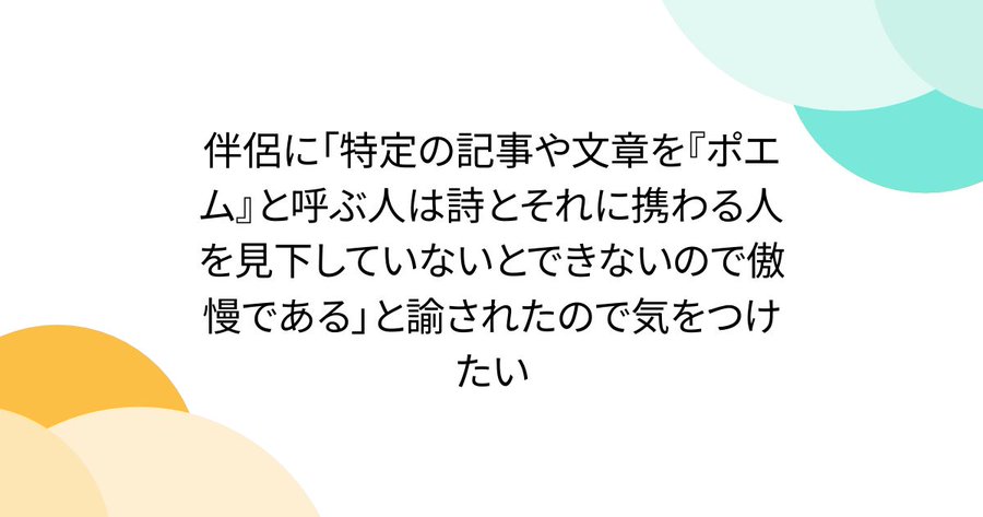 伴侶に「特定の記事や文章を『ポエム』と呼ぶ人は詩とそれに携わる人を見下していないとできないので傲慢である」と諭されたので気をつけたい https://togetter.com/li/2638208 #Togetterより ただの言葉狩り