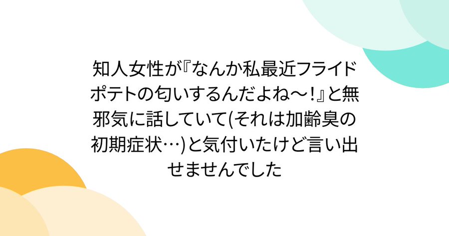 知人女性が『なんか私最近フライドポテトの匂いするんだよね~!』と無邪気に話していて(それは加齢臭の初期症状…)と気付いたけど言い出せませんでした https://togetter.com/li/2641496 #Togetterより ビジホのバスルームがどこも同じ匂いするんで、そういうものなんだと思ってたら、それが自分の匂いだということにある日気付いた