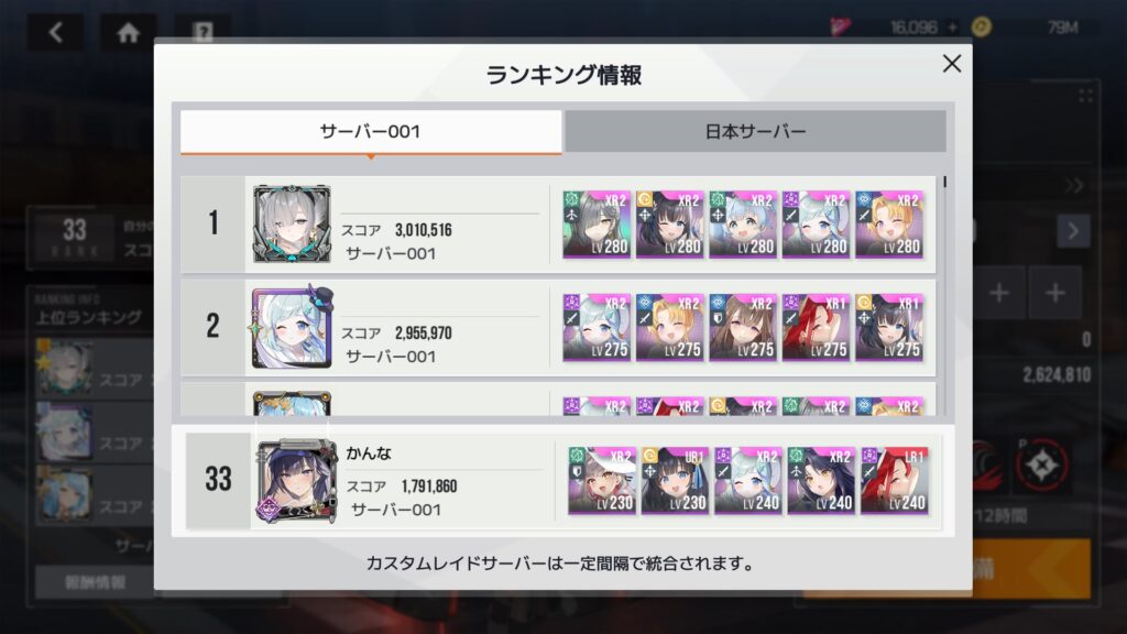 カスタマイズもだるいし、今期のカスタムレイドはここまでだなぁ。サーバー内暫定33位、国内暫定203位