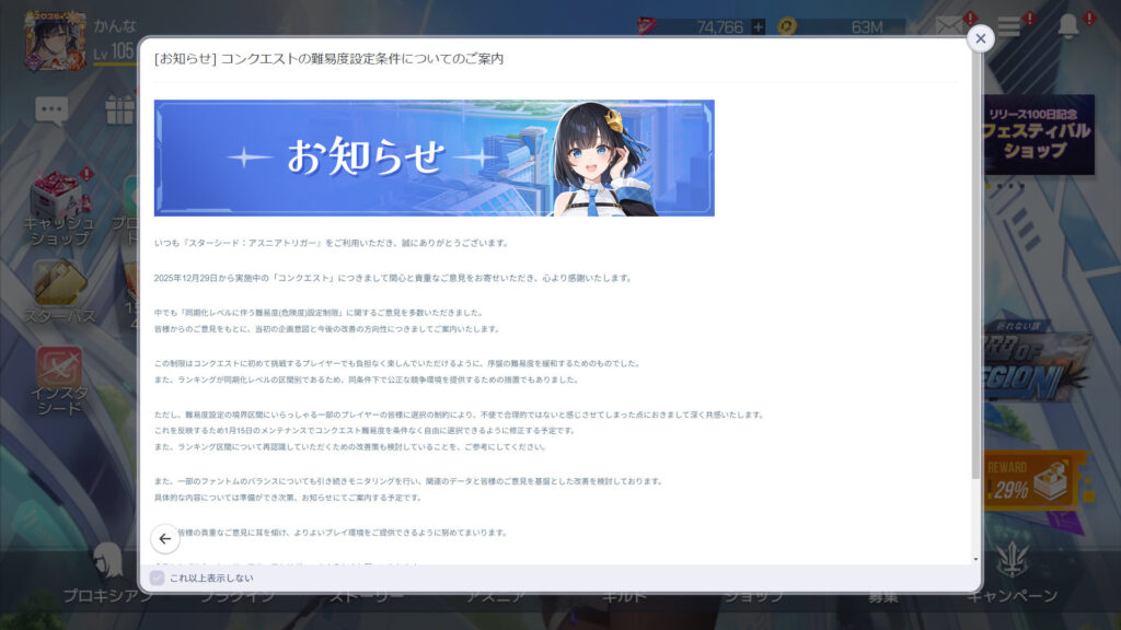 コンクエストの危険度選択制限、やはり不評だったらしく、1月15日に撤廃されるらしい