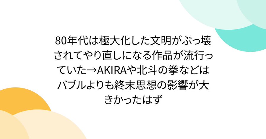 元ツイ主は氷河期世代の50代ってことで、リプでも言われてるけど、たぶん冷戦を体験してないんじゃないかな。核戦争が実際に起こるかもしれないっていううっすらとした実感があるから、AKIRAや北斗の拳やナウシカみたいな世界観もすんなり入ってくるわけで。バブルなんかこれっぽっちも関係ないし、ノストラダムスも関係ないな、80年代にはあんなものまともに取り合う奴なんか一人もいなかったし