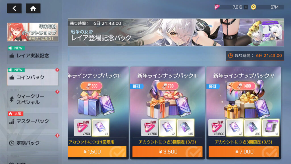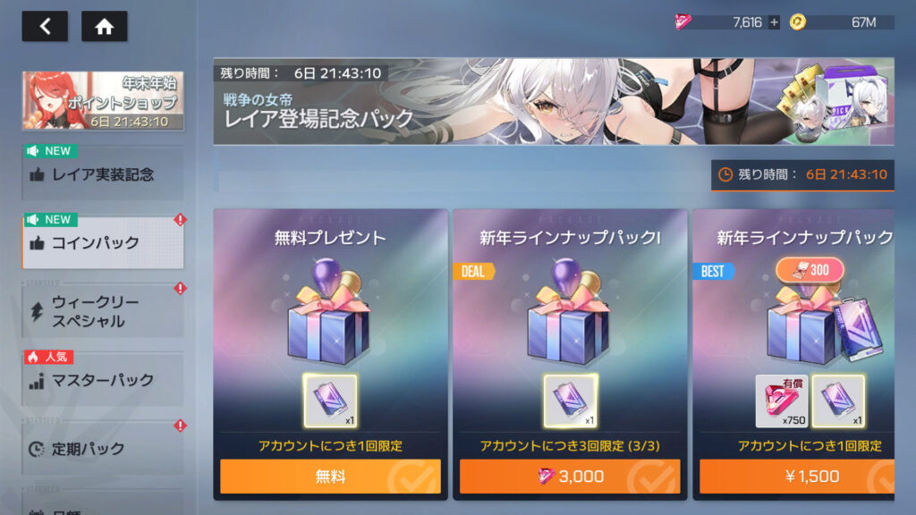 新年ラインナップ募集のコインはこれか…。無料が1個、スタービット3,000個×3個、他は有料