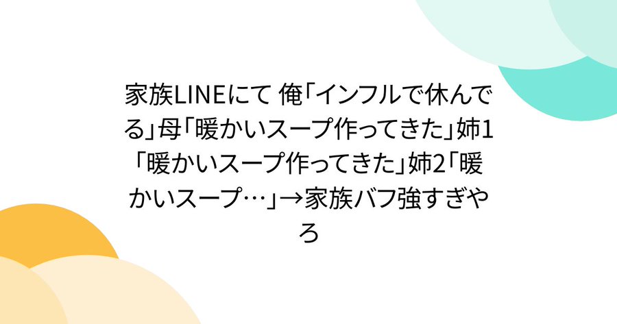 家族LINEにて 俺「インフルで休んでる」母「暖かいスープ作ってきた」姉1「暖かいスープ作ってきた」姉2「暖かいスープ…」→家族バフ強すぎやろ