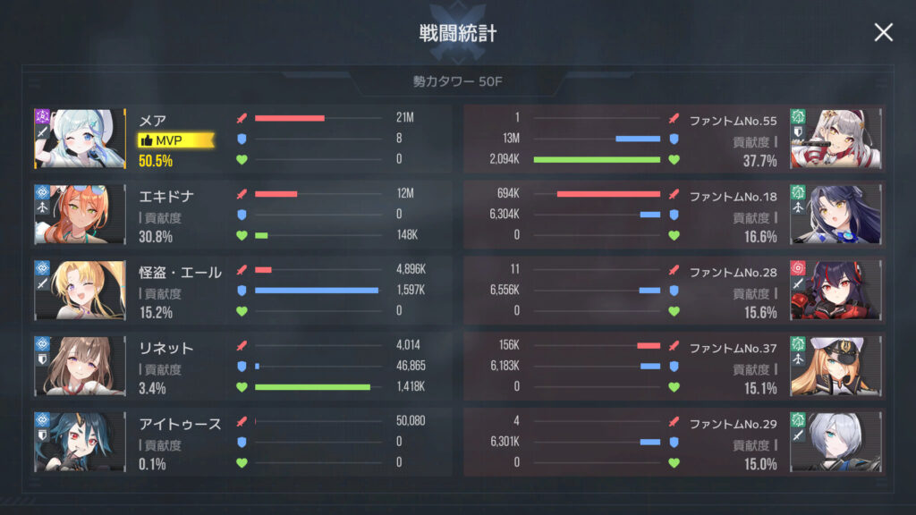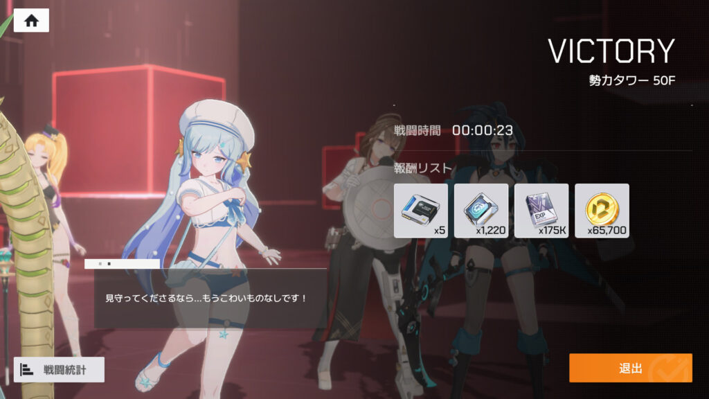 49Fまではシャーレ入りの編成でストレート。放置中失神してたら50Fで止まってたんで、戦闘記録にあわせてシャーレの代わりにアイトゥースを入れたら、一発でクリアできた