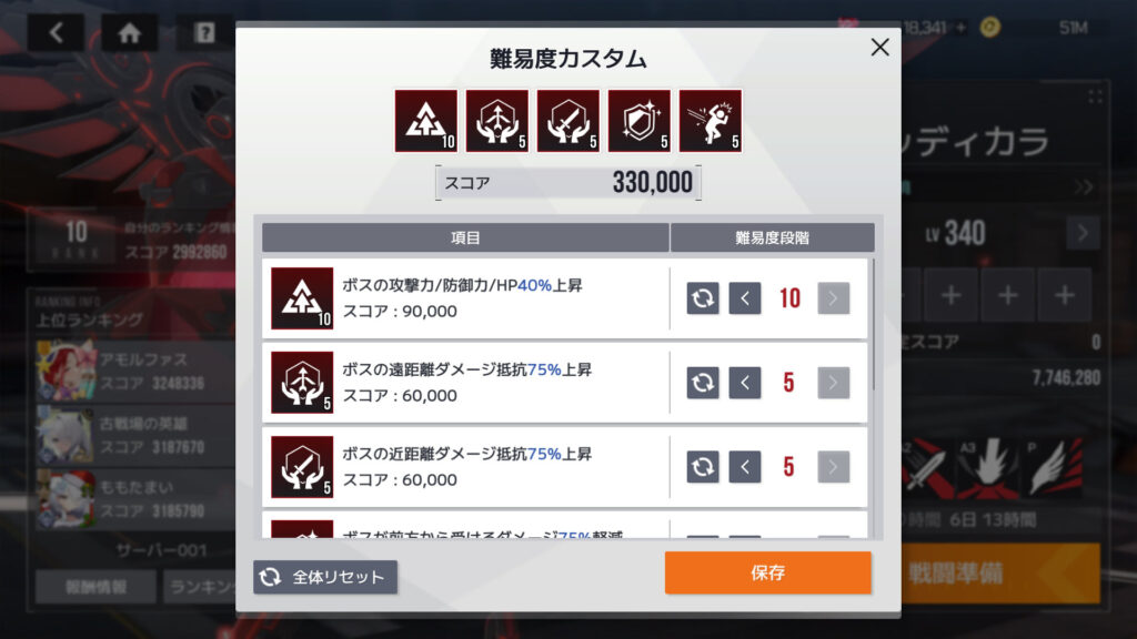 カスタムレイドの難易度カスタム、いちばんスコアが高いのは、上の5つを選んだこれか