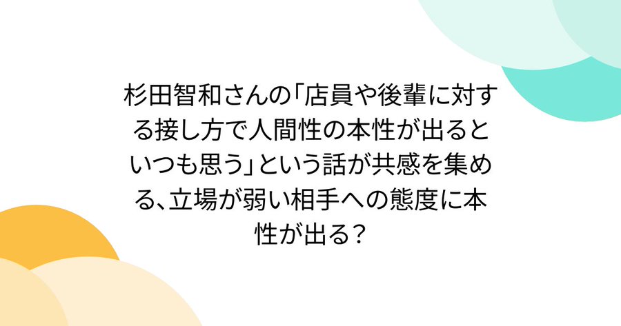 杉田智和さんの「店員や後輩に対する接し方で人間性の本性が出るといつも思う」という話が共感を集める、立場が弱い相手への態度に本性が出る? https://togetter.com/li/2652373 #Togetterより そんなことはリンカーンの時代から「本当に人を試したかったら、権力を与えてみることだ」とか言われてるし。先輩声優と何かあったんか