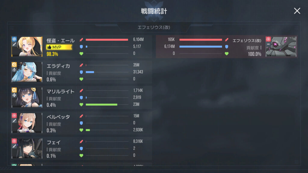 1位の人の配置で1戦やってみたところ、ダメージのほぼ100%をエールが一人で出してたんで、エールにフレデリカの装備を持たせてみたら、スコアを大幅に更新。なるほどなぁ…