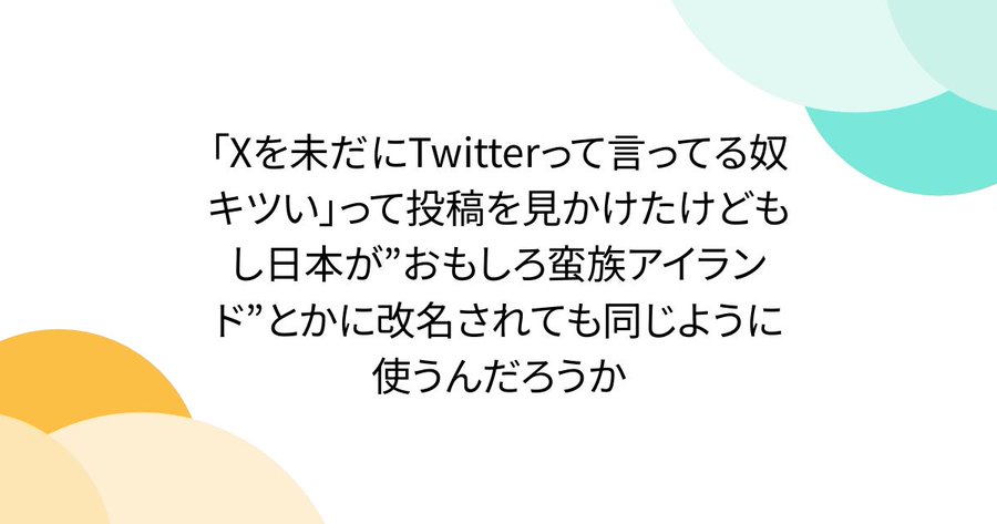 「Xを未だにTwitterって言ってる奴キツい」って投稿を見かけたけどもし日本が”おもしろ蛮族アイランド”とかに改名されても同じように使うんだろうか