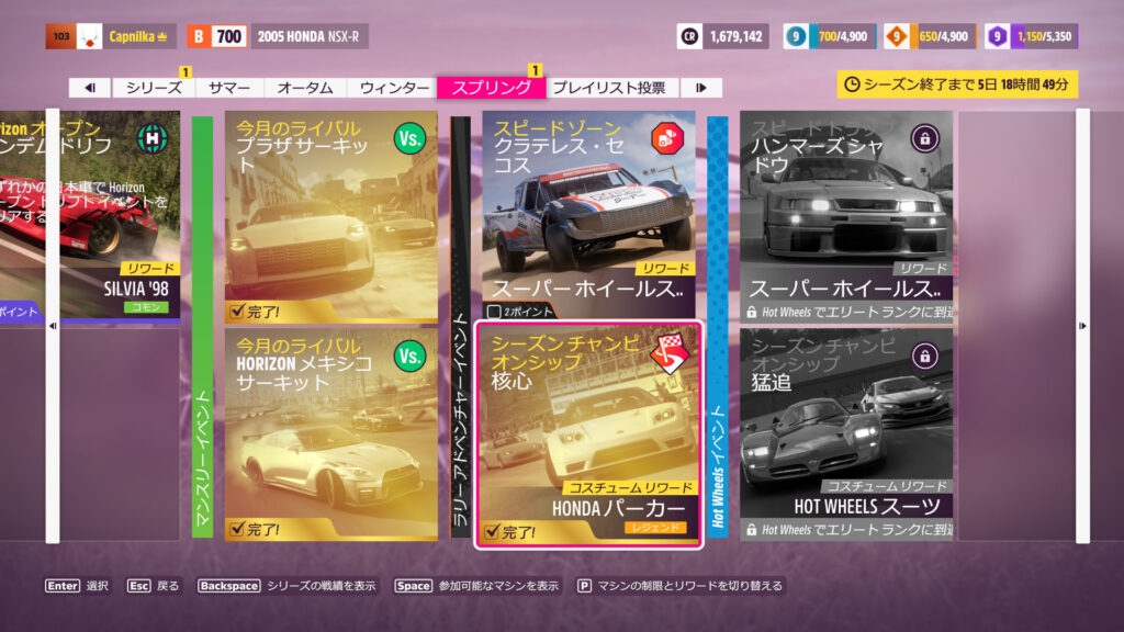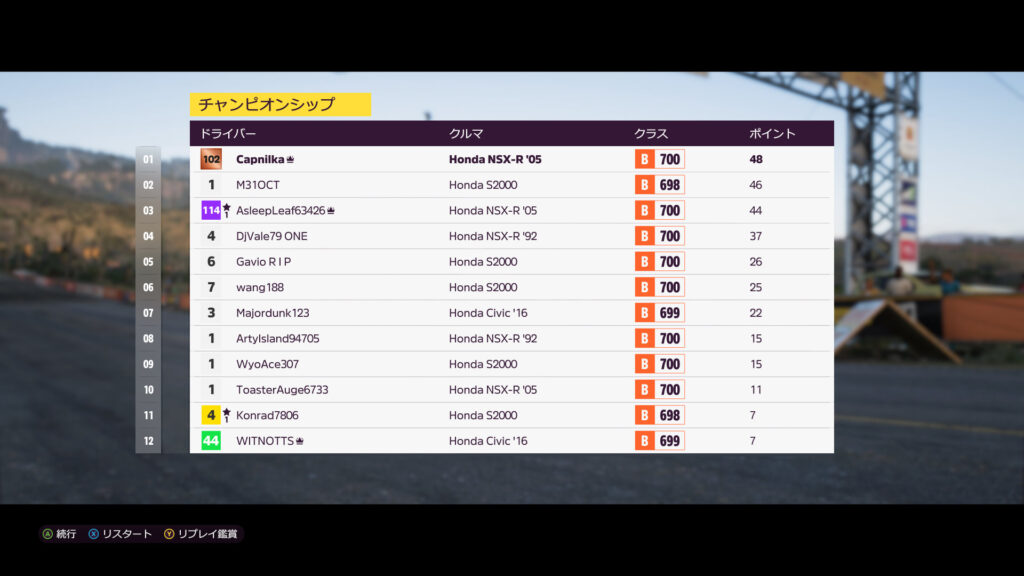 初戦1位取れたから2戦目は4位でもいいかと思ったんだけど、3戦目で苦戦した。最終コーナーでトップにぶつけて他のマシンに1位を取らせて自分は2位におさまり、何とかチャンピオンシップ1位。やっぱ最低3位は取っておく方が良さげ