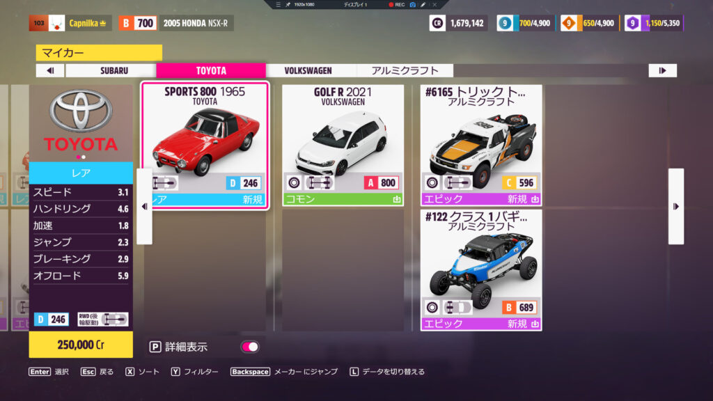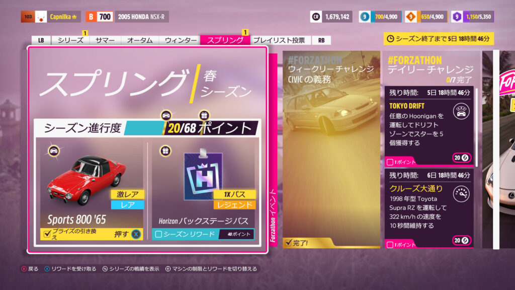 フェスティバル春シーズン進行度20ポイント報酬の1965年型トヨタスポーツ800ゲット