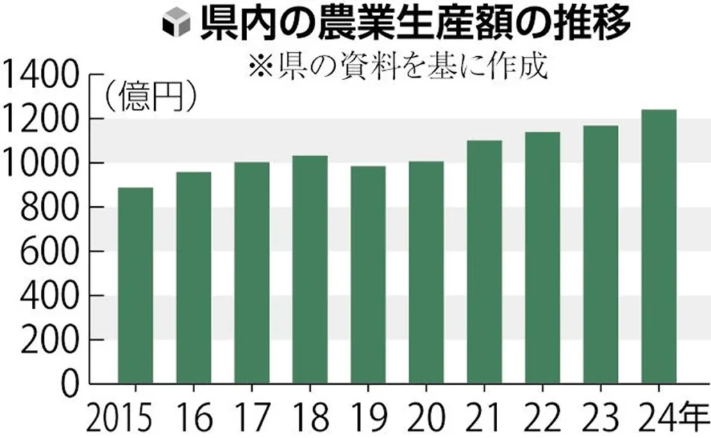 91年に1200億円に達していた農業生産額は、高齢化による農家の減少などに伴い次第に減少し、10年ほど前までは900億円前後で推移していた。