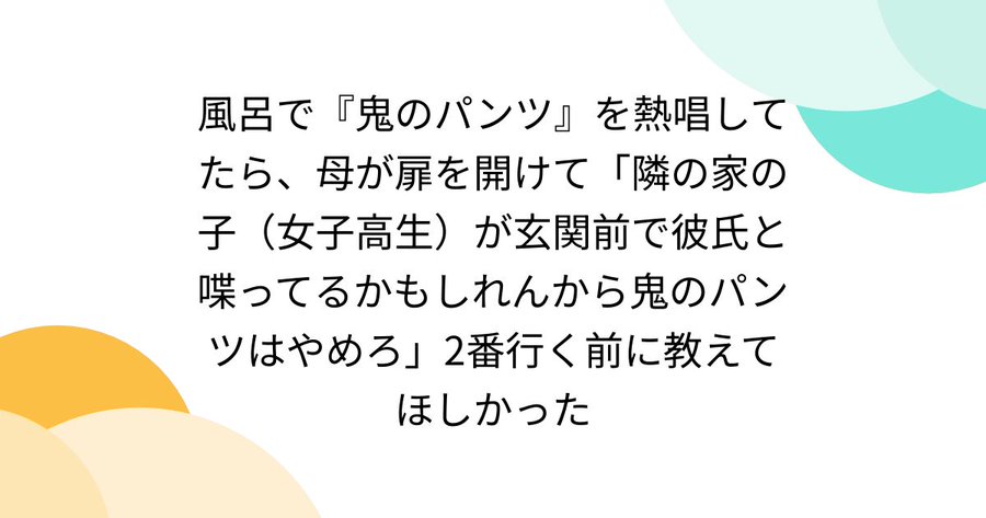 風呂で『鬼のパンツ』を熱唱してたら、母が扉を開けて「隣の家の子(女子高生)が玄関前で彼氏と喋ってるかもしれんから鬼のパンツはやめろ」2番行く前に教えてほしかった