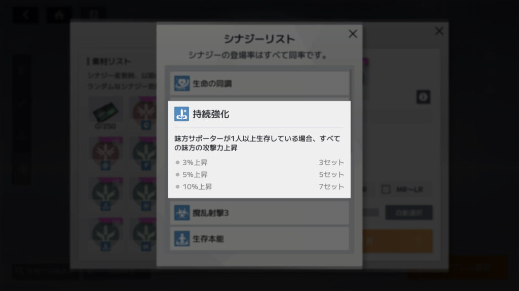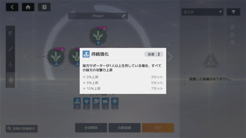 サポーターのエンブレム、素材を全部使って持続強化を2セット揃えたけど、効果はまだ発動せず
