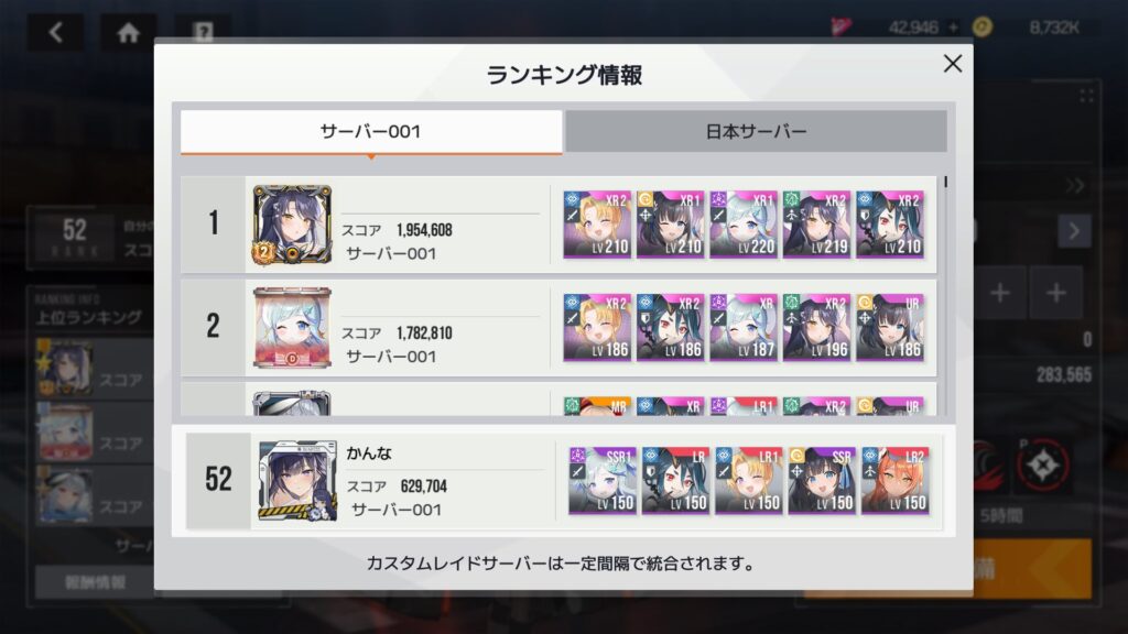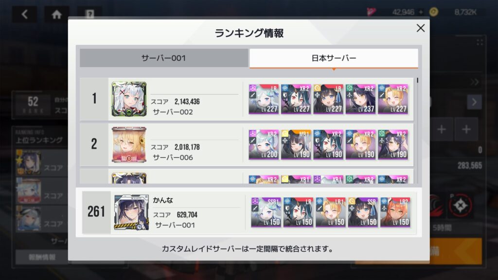 現状、サーバー内で52位、日本サーバー内でも261位か。カスタムレイドやってる人少ないんだろうな