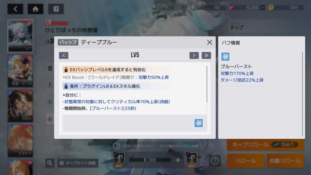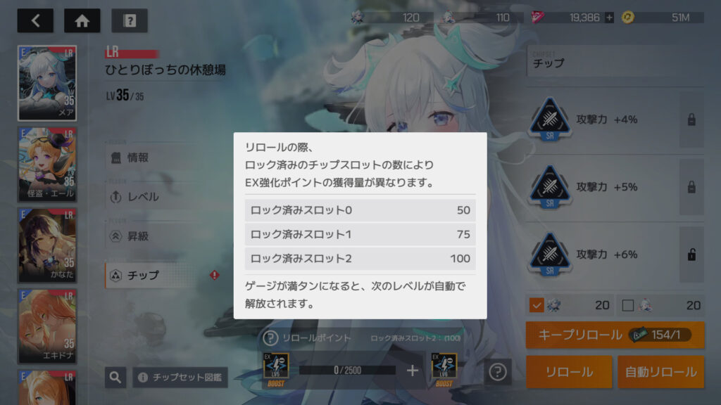 チップリロール、2スロットロックで1ロールあたり100ポイント、Lv.5まで2,500ポイントだから25ロール。キープリロールチケットだけでも行けるっちゃ行けるんだが