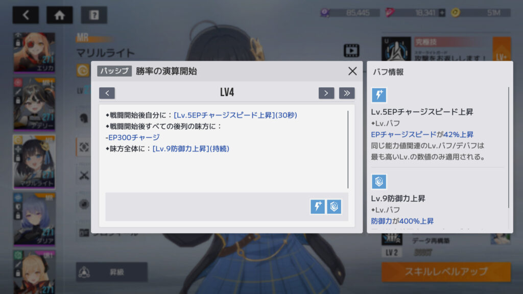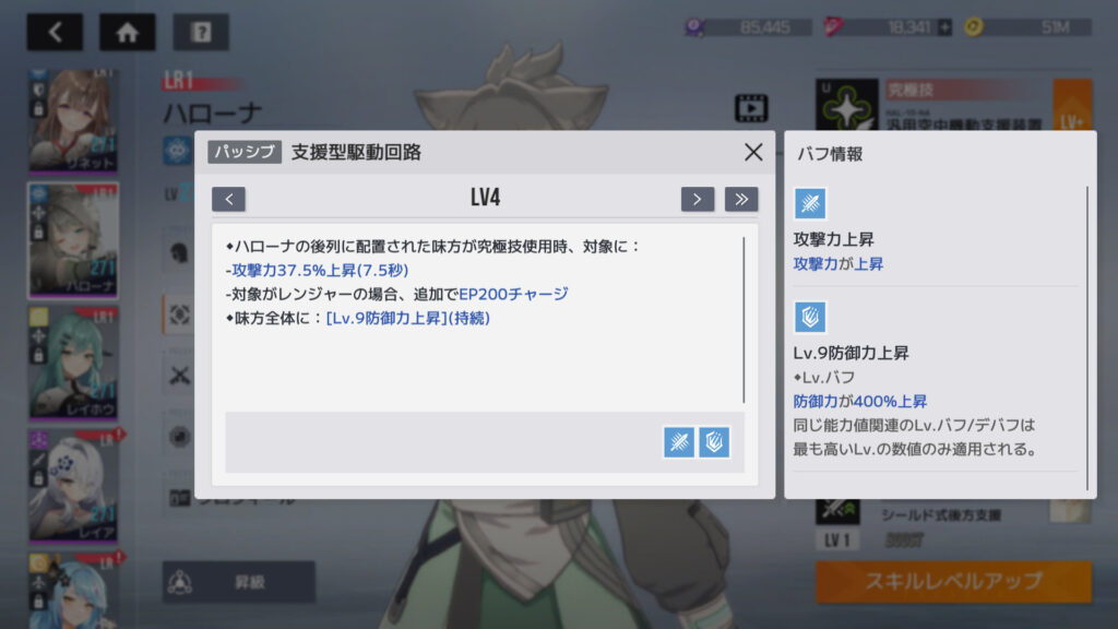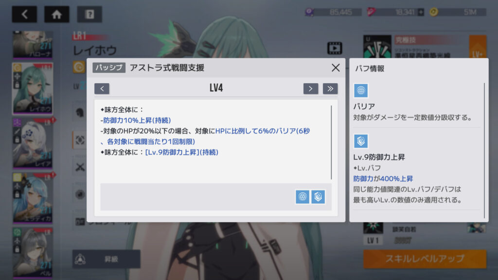SSRサポーターに追加された防御力バフってのは、このいちばん下の「味方全員に:[Lv.x防御力上昇](持続)」って奴かな。スキルLv.4で防御力400%、Lv.6で600%上昇