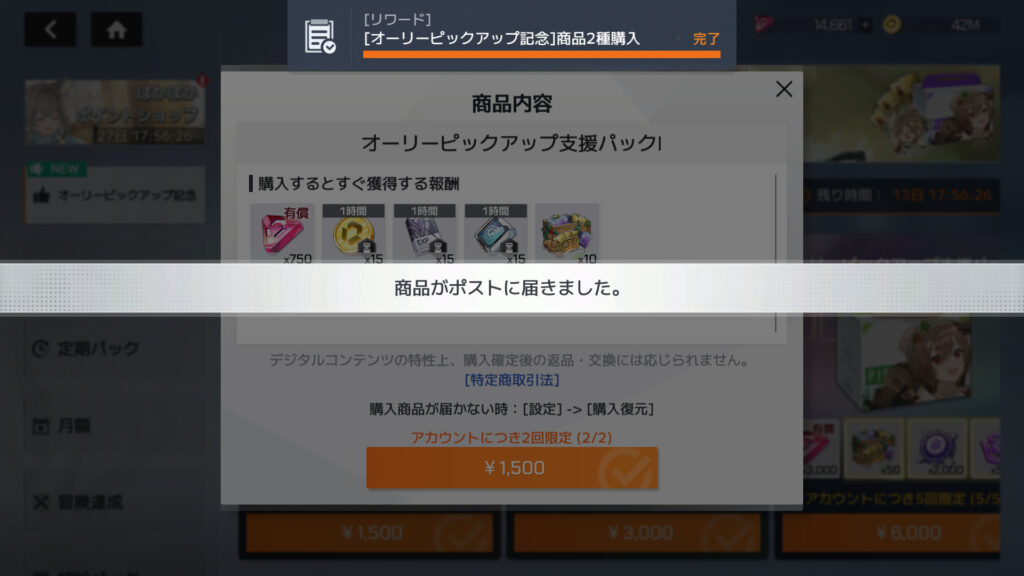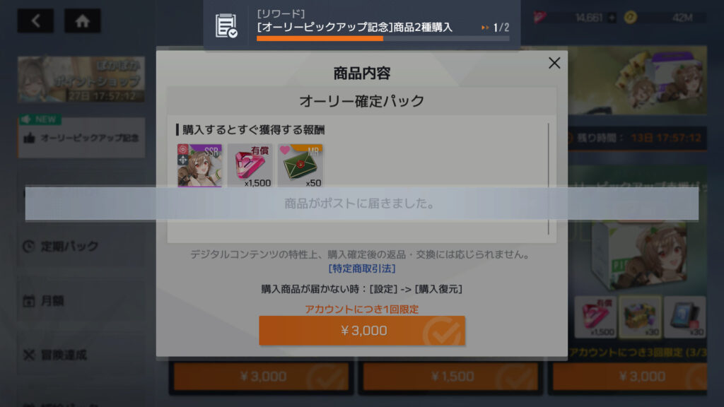 オーリー確定パックとオーリーピックアップ支援パックI購入。累計課金額135,400円