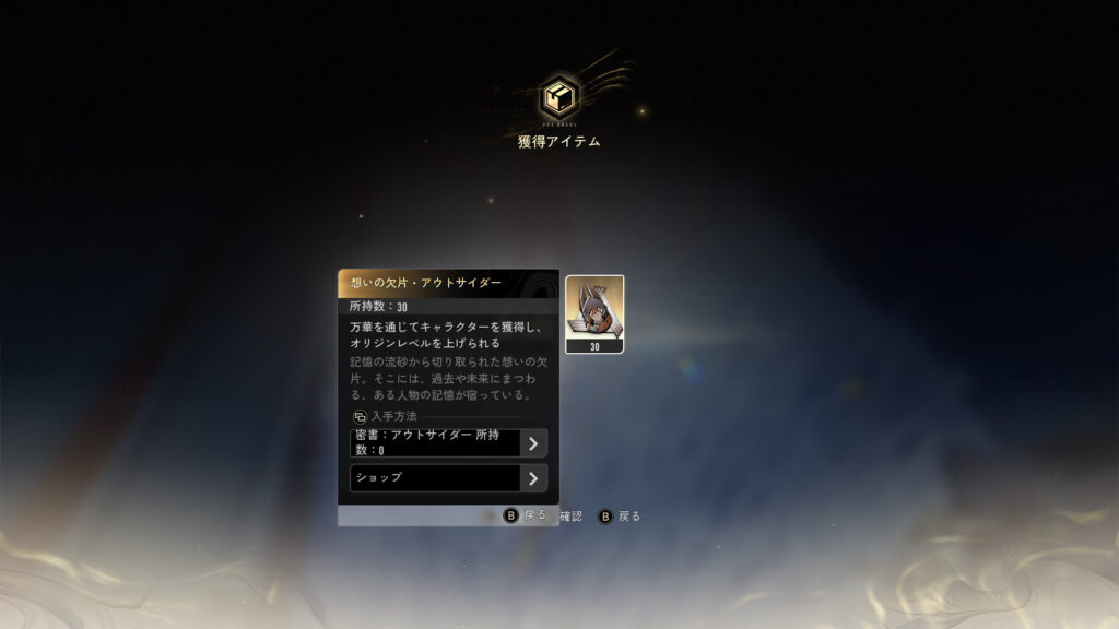 クエスト報酬の想いの欠片・アウトサイダーで、アウトサイダーゲット
