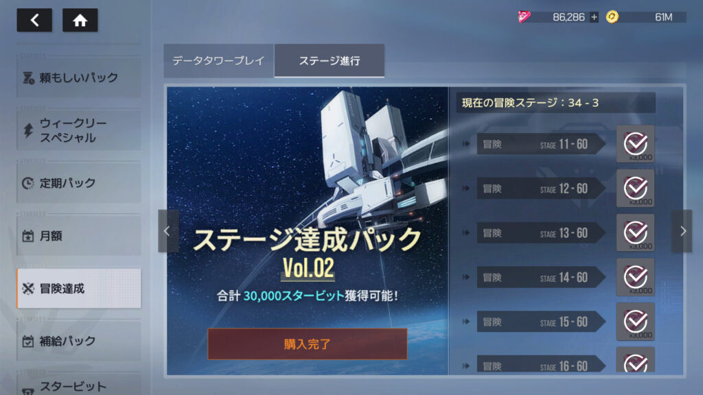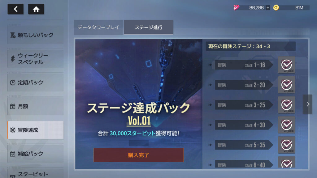 ステージ達成パックVol.01とVol.02購入。累計課金額112,900円