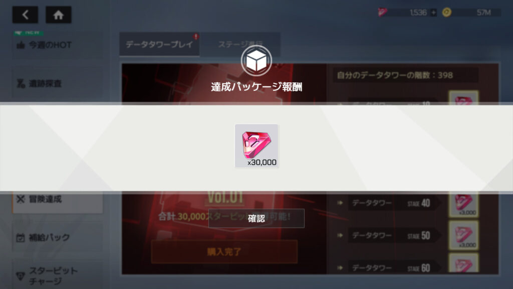 データタワー達成パックVol.01購入。累計課金額92,600円