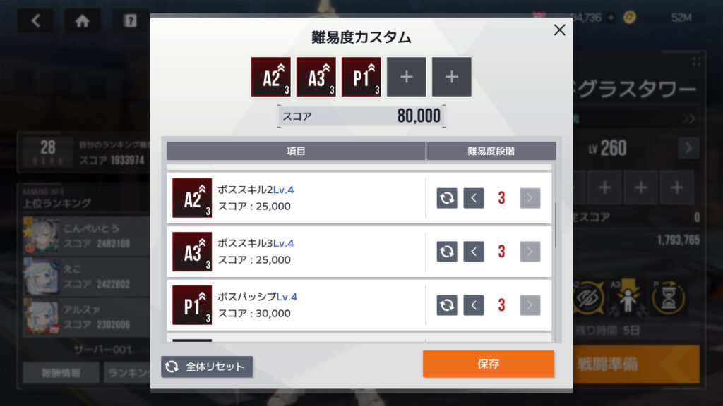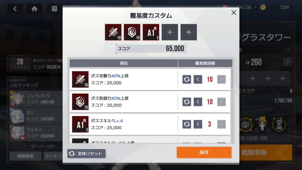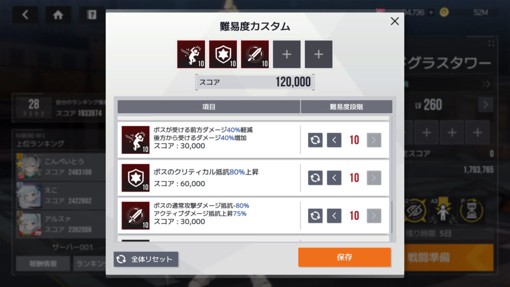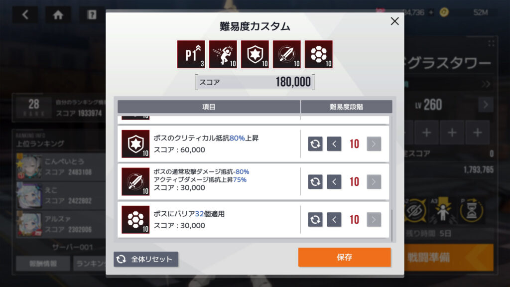 カスタムレイドの難易度カスタム各項目スコア。ボスのクリティカル抵抗上昇が60,000、他に30,000のが4項目あるんで、この5項目で最大スコアになる。トータルスコア180,000