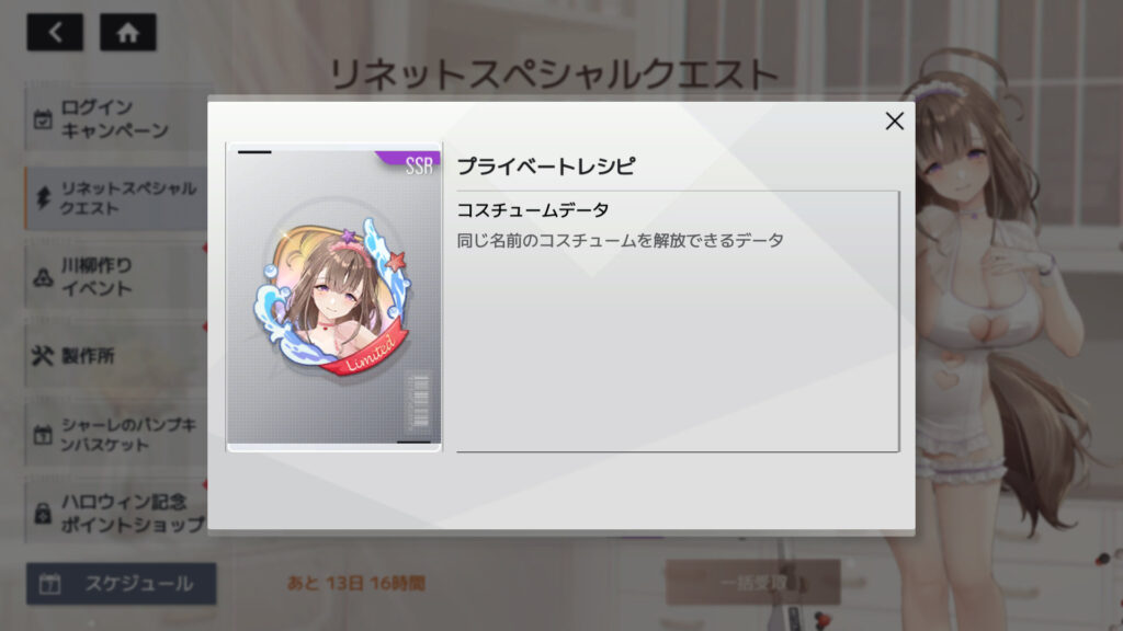 衣装のプレビューボタンないな…。アイコンSSRになってるし。まぁ右に表示されてる物凄いのが完凸XR2報酬だろうな