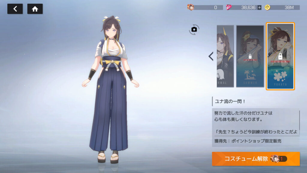 つか、ユナの衣装バグってるな…。イベント報酬で貰った道着も着れなくなってるし